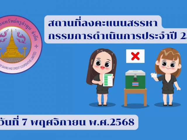 ตามประกาศของสหกรณ์ออมทรัพย์ครูลำพูน จำกัด วันที่ 25 มิถุนายน พ.ศ.2568 เรื่อง การเลือกตั้งผู้แทนสมาชิกสหกรณ์ ...