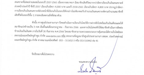 ดังนั้น ทางศูนย์ประสานงานฯ จึงขอดำเนินการเรียกเก็บโดยวิธีการฝากหักไปพร้อมกับเงินเดือนและให้สมาชิกแบ่งชำระเป็น 3 งวด เริ่มตั้งแต่เดือนกรกฎาคม – กันยายน 2566  และหากเงินไม่พอหักให้สมาชิกดำเนินการติดต่อชำระเงินเป็นเงินสด ภายในวันที่ 30 กันยายน พ.ศ.2566 โดยสมาชิกสามารถตรวจสอบรอบการคุ้มครองได้ทางเว็บไซต์ของสหกรณ์ออมทรัพย์ครูลำพูน จำกัด www.lpntsc.com หรือ สอบถามข้อมูลมายังศูนย์ประสานงานฯ สสอค. ประจำสหกรณ์ออมทรัพย์ครูลำพูน จำกัด ทางหมายเลขโทรศัพท์  053 – 511652-3 หรือ 053-510442 ต่อ 41