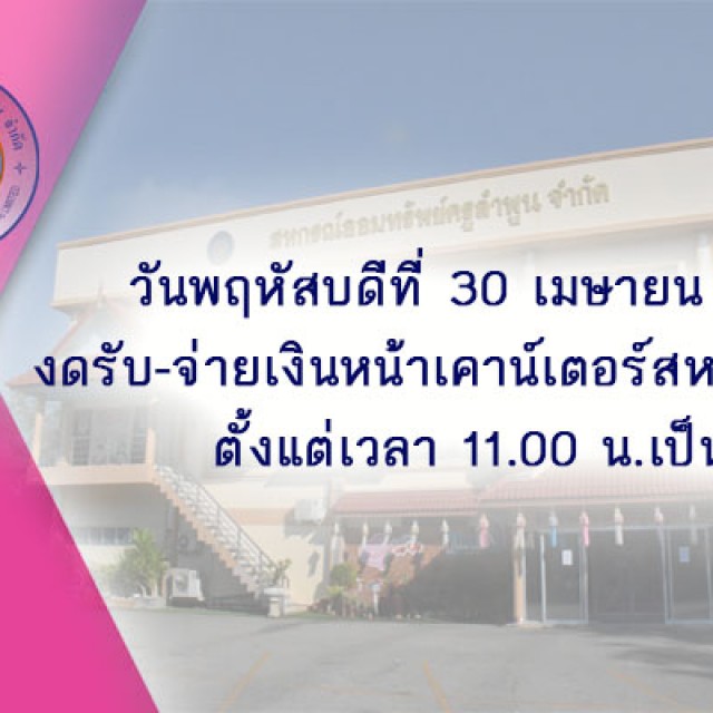 แจ้งสมาชิกสหกรณ์ออมทรัพย์ครูลำพูน จำกัดในวันพฤหัสบดี  ที่ 30 เมษายน พ.ศ.2569 สหกรณ์ฯ เปิดรับ-จ่ายเงิน เวลา 08.30 น. – 11.00 น.โดยงดรับ-จ่ายเงินหน้าเคาน์เตอร์สหกรณ์ฯ ตั้งแต่เวลา 11.00 น.เป็นต้นไป เนื่องจากธนาคารกรุงไทย สาขาลำพูน ปิดปรับปรุงสาขาจึงขอแจ้งให้สมาชิกทุกท่านทราบโดยทั่วกัน
