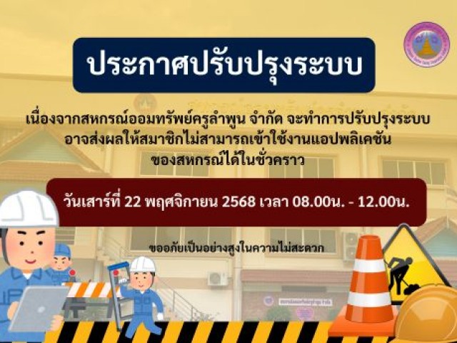 เนื่องจากสหกรณ์ออมทรัพย์ครูลำพูน จำกัดจะทำการปรับปรุงระบบ อาจส่งผลให้สมาชิกไม่สามารถเข้าใช้งานแอปพลิเคชันของสหกรณ์ได้ในชั่วคราว ...