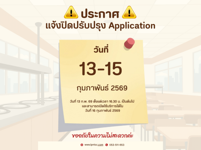 แจ้งปิดปรับปรุง แอพพลิเคชั่น วันที่ 13 -15 กุมภาพันธ์ 2569 โดยวันที่ 13 กุมภาพันธ์ 2569 จะปิดปรับปรุงตั้งแต่เวลา ...