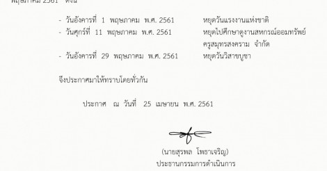 - วันอังคาร  ที่   1 พฤษภาคม พ.ศ. 2561  หยุดวันแรงงานแห่งชาติ
