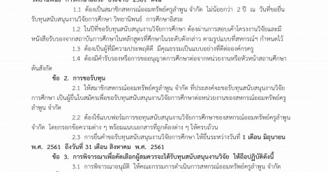 ด้วยสหกรณ์ออมทรัพย์ครูลำพูน  จำกัด  โดยคณะกรรมการดำเนินการ  ชุดที่ 52 ครั้งที่  5/2561  เมื่อวันที่  24 เดือน เมษายน  พ.ศ. 2561   ได้กำหนดจำนวนทุนและเงื่อนไขการให้สนับสนุนงานวิจัยการศึกษา วิทยานิพนธ์  การศึกษาอิสระ  ระดับปริญญาโทและปริญญาเอกของสมาชิกสหกรณ์  ออมทรัพย์ครูลำพูน จำกัด  ประจำปี  2561  ไว้ดังต่อไปนี้