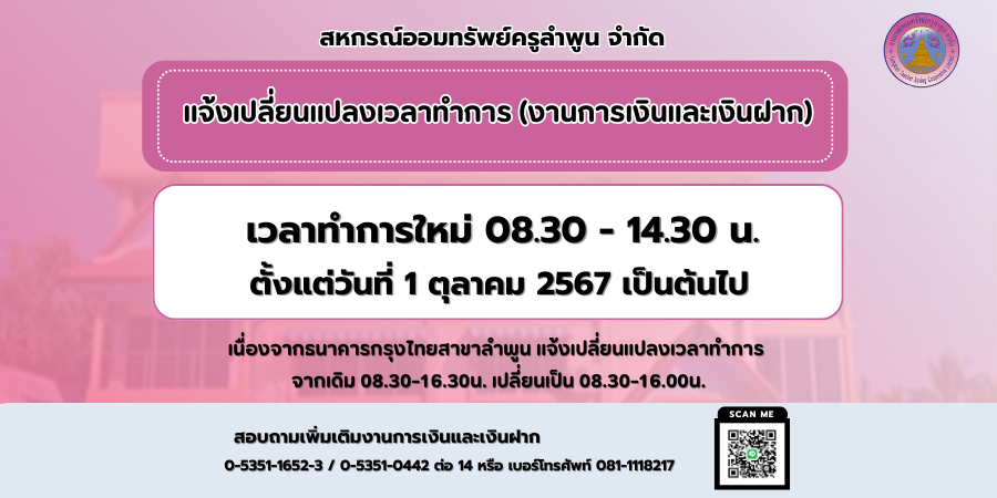 แจ้งเปลี่ยนแปลงเวลาทำการงานการเงินและเงินฝาก