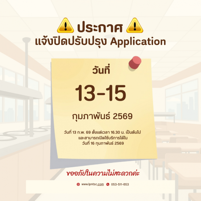 แจ้งปิดปรับปรุง แอพพลิเคชั่น วันที่ 13 -15 กุมภาพันธ์ 2569 โดยวันที่ 13 กุมภาพันธ์ 2569 จะปิดปรับปรุงตั้งแต่เวลา 16.30 น. เป็นต้นไป จนถึงวันที่ 15 กุมภาพันธ์ 2569 และสามารถใช้แอพพลิเคชั่นได้อีกที วันที่ 16 กุมภาพันธ์ 2569 ขออภัยในความไม่สะดวกค่ะ